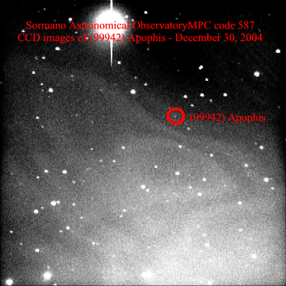 Here are available AVI(about 4 Mb) or GIF (about 1 Mb) animation of n.6 CCD images taken at Sormano (Italy) on December 30, 2004 when the object was just 14 degrees above the local horizon. Herschel Space Observatory made the first thermal infrared observations of this asteroid returning a more precise diameter of 325+/-15m. Using recent observations, NASA scientists reduce the likelihood of an hazardous encounter with our planet in 2036 but its follow up is still a priority. (see NASA ruled out Earth impact in 2036 for asteroid Apophis). Investigation to plan a spacecraft rendezvous with this asteroid is under consideration both to perform more accurate study on its chemical composition or to deflect it, if necessary, using a "gravitational tractor". |